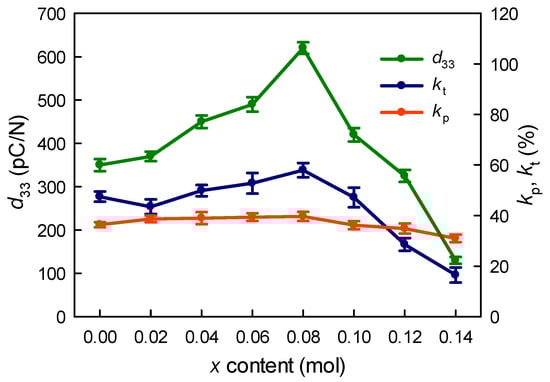 Composition-dependent piezoelectric constant d33, planar electromechanical coupling factor kp, and thickness electromechanical coupling factor kt of BT-xCS ceramics.