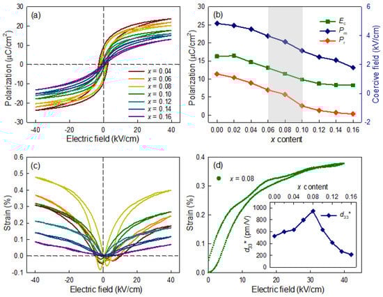 Figure 7a shows the polarization-electric field (P-E) loops of BT-xCS (0.04 ≤ x ≤ 0.16) under the driven electric field of 40 kV/cm. The P-E loops tend to become “slim” with the increase of x content. The loop for the composition of x = 0.16 presents a “curve”, demonstrating that the BT-0.16CS ceramic is transformed to the paraelectric phase []. The maximum polarization Pm, remnant polarization Pr and coercive field Ec, derived from P-E loops, are displayed in Figure 7b as a function of x content, and the corresponding values are summarized in Table 2. It is clear that the Pm, Pr, and Ec exhibit the similar decline tendency with the increase of x content. Note that the value of Ec decreases from 2.57 kV/cm to 0.57 kV/cm as the x content increases from 0.00 to 0.16, leading to an easier domain switching under the external electric field. The reduction of Ec can be attributed to the instability of the ferroelectric domains. It has been well established that the stability of ferroelectric domain is determined by the coupling of A-site cations and BO6 octahedron with ferroelectric properties for an ABO3 type perovskite structure, and the distortion of lattice structure induced by the substitution of Ca2+ and Sn4+ weakens the coupling between A-site cation and BO6 octahedron of BT-xCS, resulting in the instability of the ferroelectric domains and thereby decreasing the value of Ec [,]. Meanwhile, Pm and Pr decrease from 25.4 μC/cm2 and 11.40 μC/cm2 to 13.2 μC/cm2 and 0.29 μC/cm2 as the x content increases from 0.00 to 0.16, respectively. Figure 7c exhibits the bipolar field-induced strain as a function of electric field of BT-xCS (0.04 ≤ x ≤ 0.16) ceramics under the electric field of 40 kV/cm. Butterfly-shape S-E loops are observed in the compositions of x < 0.10, and this type loop is intrinsically determined by their ferroelectric phase structure. The loops tend to be slender in the compositions of x > 0.10. The values of positive strain Spos and negative strains Sneg increase initially to 4.02% and 0.75% at x = 0.08, and then decrease to 0.67% and almost zero at x = 0.16, respectively. Since the external electric field is much higher than Ec, the values of Spos are very close to that of the maximum strain induced by the unipolar electric field (Suni) []. The unipolar field-induced strain of BT-0.08CS is presented in Figure 7d, and the maximum value of Suni reaches 0.38% under the electric field of 40 kV/cm. The derived piezoelectric strain coefficient d33* as a function of x content is shown in the inset of Figure 7d. The values of d33* are calculated according to the following equation: