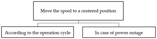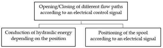 11]. As hydraulic systems are often embedded within an electrical higher-level control system, this main function can be further extended to the “Opening/Closing of different flow paths according to electrical control signals.” This main function can be divided into two sub-functions, the “Conduction off hydraulic energy depending on position” and the “Positioning of the spool according to an electrical signal.” See