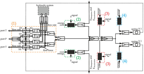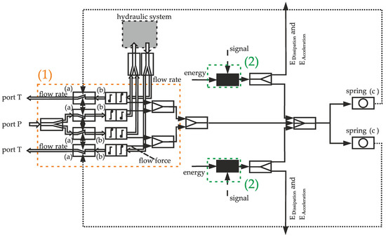 Figure 3, Subsystem (1) represents the functionality derived from the spool’s geometry. Flow entering the system via port P is guided and transmitted by the metering edges to the working ports (a) of the valve. A part of the carried energy is transformed into mechanical energy (b), which acts as a flow force on the spool. Once the fluid leaves Subsystem (1), it enters an arbitrary hydraulic system. Any fluid flowing back into the tank leads to additional flow forces.