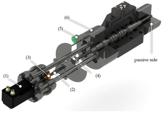 Figure 5) of the actuator is used to explain the operating concept of the magnetic relief system since no feed-through of the main drive train needs to be included. The operation method of the active side is identical. The displayed configuration of the magnetic relief system in