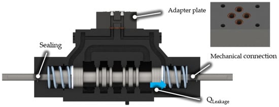 Figure 7b shows that the pressure level is non-negligible and that a mere chamber pressure of 10 bar requires a significant increase in force provided by the actuation system, which can be seen due to the increased hysteresis between the upper and lower lines of the curves of forward and backward movement. In this case, friction forces have nearly doubled, achieving values of 80 N. The pressure in the pilot chambers, therefore, must be reduced as much as possible. Since there is a leakage flow over the spool, the pressure in the pilot chamber is adjusted to the pressure at the T port of the valve. Accordingly, the maximum pressure in the tank line must be considered during the design of externally attached actuation systems. If the pressure in the tank line can reach high values, an additional drain line within the adapter plate can be used to ensure sufficiently low-pressure levels in the pilot chambers. The mentioned design details are only valid for independently designed externally attached actuation systems. The development of a pressurizable actuation system would render the added sealing and the drain line redundant. Likewise, the adapter plate is unnecessary if there is an existent direct connection between the pilot chambers.