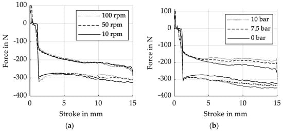 Figure 7a shows, the necessary force to move the spool does not increase significantly, even at tenfold the actuator’s speed. Consequently, it is concluded that the resulting effect is negligible if a sufficient compensation channel is actualized.