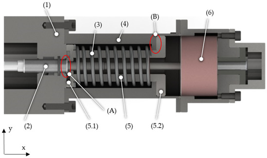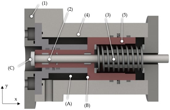 In the concept of the magnetic relief system, the additional force of subsystem (4) is applied by a holding solenoid. The spring is thereby kept in a tensioned state as long as the holding solenoid is energized. Holding solenoids are perfectly suited for applying high forces on ferromagnetic bodies over small air gaps. However, if the air gap increases, the magnetic force drops drastically since the magnetic flux through the counterpart falls significantly with increasing gap height. Therefore, holding solenoids are only suitable to hold the compressed springs in position and are not capable of compressing the springs due to the large stroke required. This must be performed by the main actuator, which, therefore, must be designed to overcome the initial spring forces until the solenoid can hold the spring by itself. A sectional view of the designed magnetic relief system is shown in