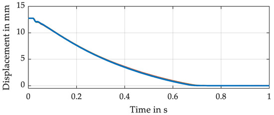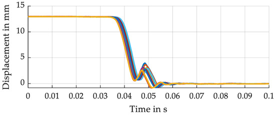 As can be seen, the reset times of the system for displacements of about 13 mm is around 700 ms. A reproducible behavior can be identified, with only small deviations between the measurements, which is why most curves are congruent. During the reset process, the pressure in the relief chamber decreases from around 5 bar to 1 bar. The reaching of the end position can also be identified in the plot of the pressure in the relief chamber. When the end position is reached at 700 ms, the slope of the pressure curve changes drastically.