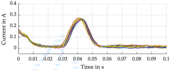 The relief system was displaced manually while the magnet was energized, thus compressing the spring. As the solenoids are deactivated, the effective force on the spring drops and the reset process begins. The data logging started at the time when the solenoid was de-energized, measuring only the reset time. An additional sensor was placed in the power supply line measuring the current of the holding solenoid. The results of the displacement signal and the current signal are shown in