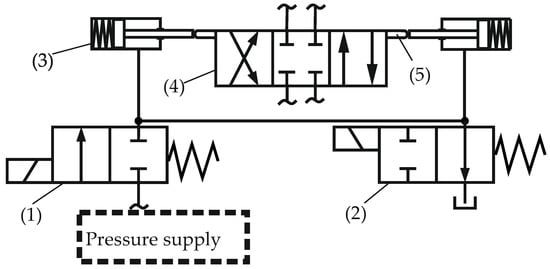 While moving the spool into the end position, a part of the energy provided by the actuator is simultaneously used to compress the spring, thus storing energy within. The time dependency between the energy storage and the spool movement can be solved by separating and redistributing the spring functions into separate components. Here, the first function, “centering the spool according to the operation cycle,” can be carried out by the main actuator using a proportional actuator as presented above. The energy stored in the springs is then only used in case of failure, and the springs stay compressed most of the time due to the additional force exerted by subsystem (4). This reduces the force requirements of the main actuator, as the high spring forces are not needed to be overcome during normal operation since they can be temporarily removed. However, these solutions are merely an extension of existing actuator concepts, such as the actuation system presented above based on a stepper motor and a threaded rod or actuation systems similar to those presented in [