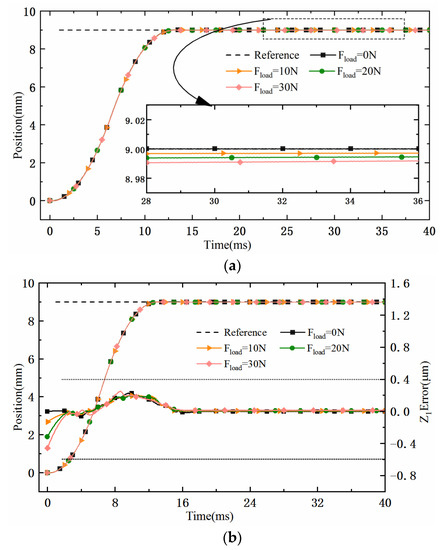 The response performance and control steady-state accuracy of the proposed control to different loads under the same step target displacement were tested. Figure 7 shows the response curve of a 9 mm step signal under different load conditions. It can be seen from Figure 7a that under the load conditions of 0 N, 10 N, 20 N, 30 N, the ISM-ADRC algorithm of the electromagnetic linear actuator can quickly make tracking without overshoot. The response times were 12 ms, 12.05 ms, 12.1 ms, 12.1 ms, results in good agreement with the tracking curves of different loads. The steady-state error under the maximum load was kept within 1%. Figure 7b shows the displacement estimation curve of the extended state observer and the error curve with the actual displacement under the step response conditions under different loads. It can be seen that the large change in the displacement estimation error at the initial moment was due to the different load. However, under the effective observation of the extended state observer, the change of the error curve approaches 0, and the maximum displacement observation error is much less than 1 µm. Figure 7c shows the step response under different loads, the speed estimation of the extended state observer and the error curve with the actual speed. The speed estimation curves of different loads are in good agreement, and the maximum estimation error of the speed was less than 0.01 m/s, which is within a reasonable range.