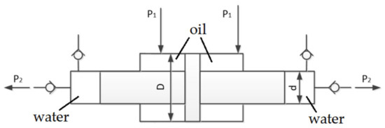 In this paper, the double-acting pressurized cylinder is adopted, which is in the form of a double-extraction rod [18,19,20]. There is no idle stroke, which improves the working efficiency. The low-pressure chamber is an oil chamber, the inner diameter is d; the high pressure chamber is a water chamber, and the inner diameter is D [21]. The two high pressure water chambers are connected to a circuit consisting of four check valves. When the pressurized cylinder piston moves to the left, the left chamber discharges high pressure water and the right chamber suctions in water. When the piston moves to the right, the right chamber discharges high pressure water and the left chamber suctions in water. The water suction and discharge processes are simultaneously performed, and the input lower pressure hydraulic oil is converted into higher pressure water for use in the hose pressure test system. A structure diagram is shown in Figure 1.