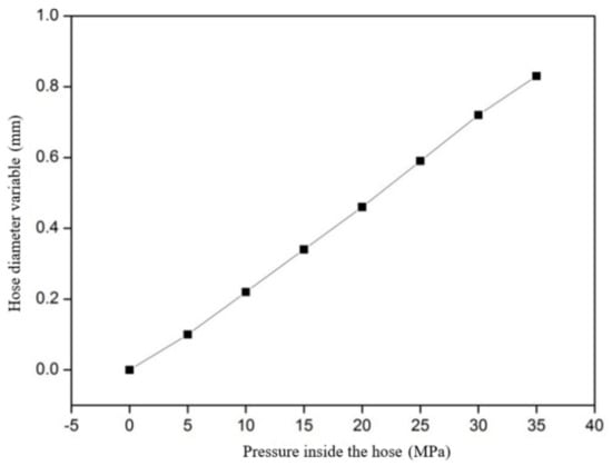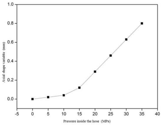 It can be seen from Figure 3 that the axial deformation is 0.03 mm when the pressure is 10 MPa, and the axial length deformation of the hydraulic hose under pressure is −0.014%. In Figure 3, the axial deformation is 2.82 mm when the pressure is 100 MPa. Therefore, the axial length deformation of the hydraulic hose under pressure is −1.34%. It meets the mechanical industry standard JB/T8727-2004 which stipulates that the axial length deformation of the hose under pressure is −2–4%. When the length of the hose assembly is 6000 mm, the length becomes 5999.1 mm after being subjected to a pressure of 10 , and the length becomes 5919.6 mm after being subjected to a pressure of 100 .