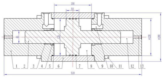 According to the above conditions, we have designed a double-acting pressurized cylinder [23,24]. The assembled diagram of the designed pressurized cylinder is shown in Figure 5, where the oil chamber 8 and the water chamber 12 constitute two chambers of the pressurized cylinder. The seal between the piston 2 and the low-pressure chamber cylinder 6 is made of a grate ring with a working pressure of 40 [25], which is much higher than the low pressure. The required oil pressure in the chamber is 13.7 MPa, which meets the working requirements. The seal between the piston 2 and the high pressure chamber cylinder 1 is sealed by a U-shaped slip ring type [26], and its maximum withstand voltage can reach 300, which is much larger than the water pressure of up to 100 in the high pressure chamber to meet the working requirements. The static seal between the low-pressure cavity cylinder 6 and the high-pressure cavity cylinder 1 is sealed by an O-ring [27]. The working pressure can reach 40 , which is much larger than 13.7 , so it satisfies the working requirements. A ring 4 is provided in the high- pressure chamber to cushion the piston 2 [28].