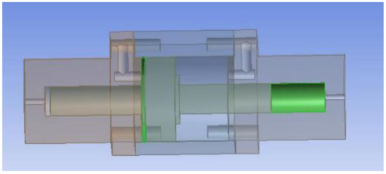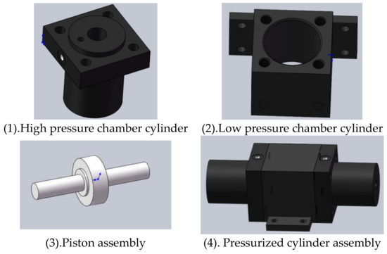 According to the structural parameters of the pressurized cylinder calculated in the previous section, the Solidworks [31] software is used to design a three-dimensional modeling for the various components of the pressurized cylinder. Each part is physically assembly, ignoring the seal groove and the threaded hole of the oil port changed into a hole. The three-dimensional modeling of the pressurized cylinder is shown in Figure 7.