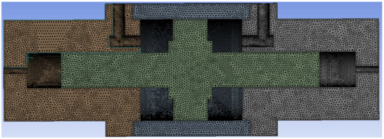 According to the above content, we adjust “Relevance” to 100, “Relevance Center” to fine, and “Element Size” to 0.002 mm. Then the number of nodes divided by the piston at the leftmost end is 944,787, and the number of cells is 586,402; the number of nodes divided at the middle end is 925,471, and the number of cells is 576,809; the number of nodes divided at the rightmost end is 948,116, and the number of cells is 592,653. The meshing results are shown in the figure, where the piston is in the middle as shown in Figure 9.