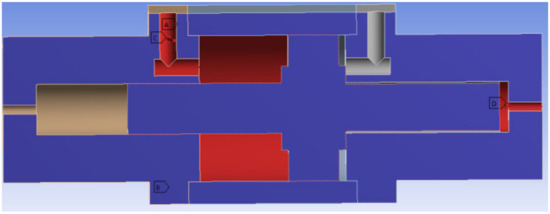 The connection mode of the low pressure chamber and the high pressure chamber of the pressurized cylinder is set to “Bonded”, the connection mode of the low pressure chamber and the piston is set to “Bonded”, while the connection mode of the piston rod and the high pressure chamber is set to “Frictionless”. The “Fixed Support” constraint is imposed on the bolt holes of the pressurized cylinder, and the “Frictionless Support” constraint is imposed on the symmetry plane of the pressurized cylinder. At the same time, a pressure of 100 MPa is applied to the high-pressure chamber of the pressurized cylinder, while a pressure of 13.7 MPa is applied to the low pressure chamber. The applied load is shown in the figure. Figure 10 shows the case where the piston is at the rightmost end, and the red part in the figure is the loading part.