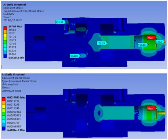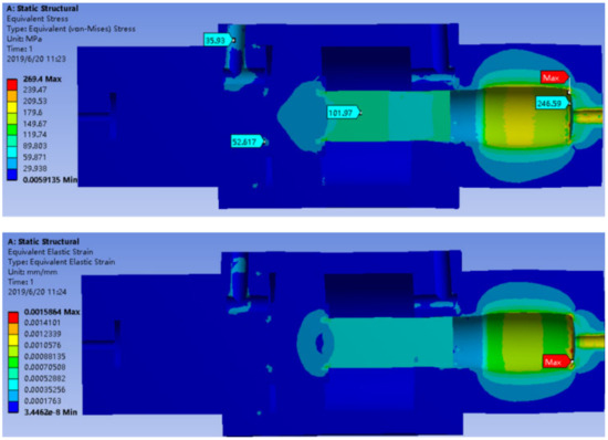 Stress analysis cloud and strain analysis cloud diagram when the piston is at the far right.