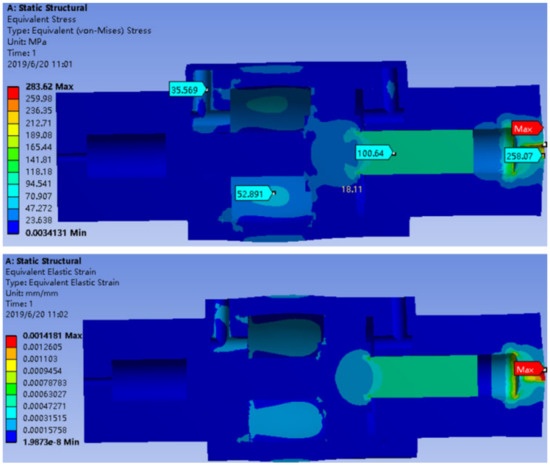Stress analysis cloud and strain analysis cloud diagram when the piston is at the leftmost end.