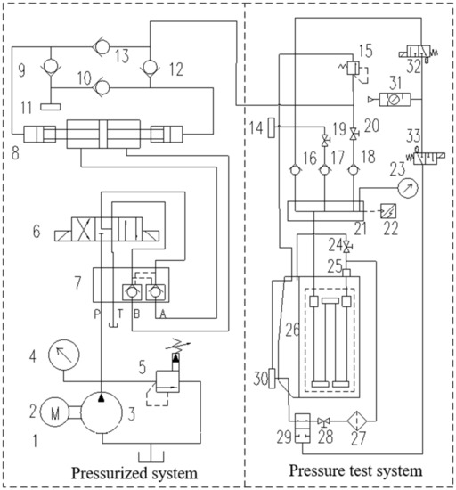 Booster circuit diagram. 1—tank; 2—motor; 3—vane pump; 4 and 23—pressure gauge; 5—pilot type proportional relief valve; 6—three four way solenoid valve; 7—superimposed hydraulic control check valve; 8—double acting booster cylinder; 9 and 10—water single Valve; 11—Water suction port; 12 and 13—water outlet check valve; 14—Filling port; 15—Low-pressure spillway valve; 16–18—high pressure check valve; 19,20,24 and 28—high pressure needle valve; 21—large valve block; 22—lressure transmitter; 25—small valve block; 26—experimental device; 27—high pressure filter; 29—high pressure pneumatic control valve; 30—circulating water outlet; 31—pneumatic triplex; 32 and 33—electromagnetic reversing.