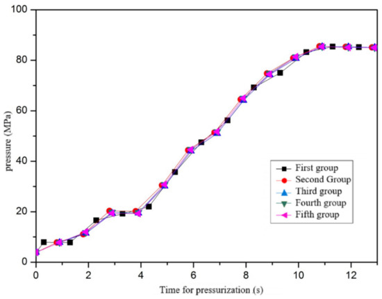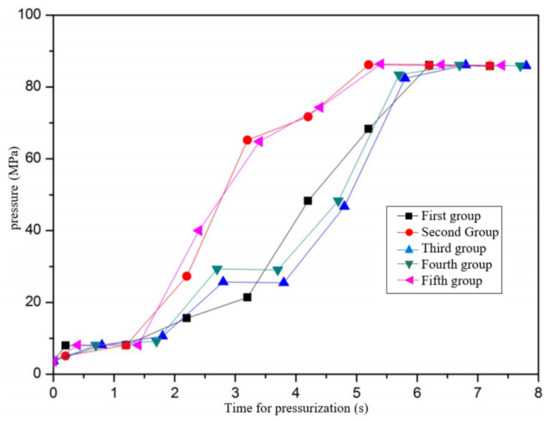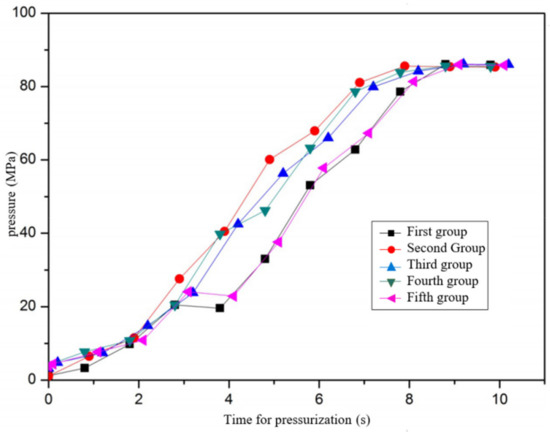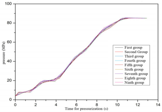 It can be seen from Figure 17 that the results of the nine groups of experiments show that they can be pressurized to 85 within 12 s, which meets the performance requirements of the equipment. That illustrates the feasibility of the system, and verifies the rationality of the design of the pressurized cylinder. From the trend of the pressure-time curve, the time required to pressurize to 100 is even about 13 s, which is shorter than the 15 s calculated by the previous design. The reason should be that the actual deformation of the hose is not theoretically analyzed. The pressure required by the pressurized system is greater and the pressurization time is shortened.