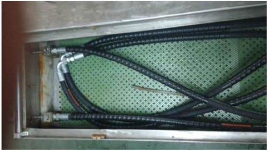 A 12EFG6K hose assembly was selected for pressure test. Its technical specifications require a 12EFG6K hydraulic hose to be pressurized to 100 MPa within 15 s. The length of each hose assembly was 1800 mm. To achieve the maximum hose capacity, six hose assemblies (V = 3.06 L) were selected and connected using a transition joint. It is shown in Figure 16.
