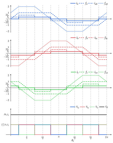 where the first term on the right-hand side yields the vector of flux linkages due to the magnetic field produced by the stator time-varying currents and the second term is the vector of flux linkages due to relative motion between the stationary stator windings and the rotary PM. The inductance ℓ represents the effect of self and mutual induction in the stator windings carrying balanced currents. The flux linkages due to the magnetic field produced by the PM are, however, dependent on the magnet arrangements and the winding uniform distribution. This is taken into account in [26] by modeling these flux linkages as quadratic functions of rotor position, so that the time-derivative of the flux linkages leads to trapezoidal back-emf waveforms, whose magnitudes are proportional to the rotor speed , the back-emf constant and the number of poles P. The induced voltages due to the rotor-produced flux linkages are