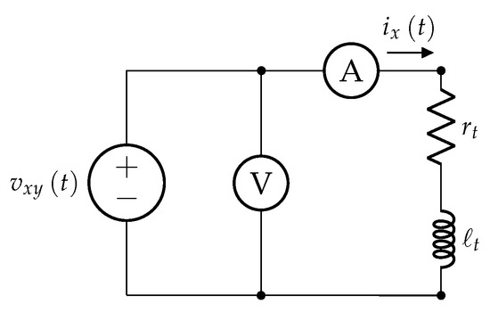 The resistance and inductance of a BLDC motor can be determined by applying a constant DC voltage across two phases of the machine while blocking the rotor. This is equivalent to making in (8) and a constant voltage. Assuming an ideal neutral connection [7,29], this convenient setup leads to linear, first-order differential equations for the pair of phases x and y