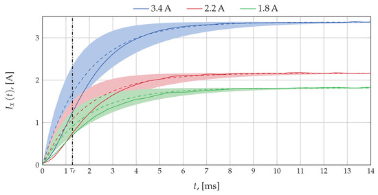 It can be seen that the experimental results are into these intervals for the first-order approximation (9) for time values above . Below this time, neither response falls within the expected estimated region. As can be seen in the Figure 4, the experimental curves are those of a higher order dynamic system, which reveals the deficiencies of the first-order model approximation used in this test. This difference is due to dynamics, such as magnetic nonlinearity, or the rotor position, that are not considered in the utilized model. Regarding the rotor position, it is worth mentioning that the tests were performed by letting the rotor align itself to the field produced by driving current through the windings under study and locking it in that position. So for each phase the tests were made in similar conditions regarding the initial position of the rotor and the respective magnetic flux path.