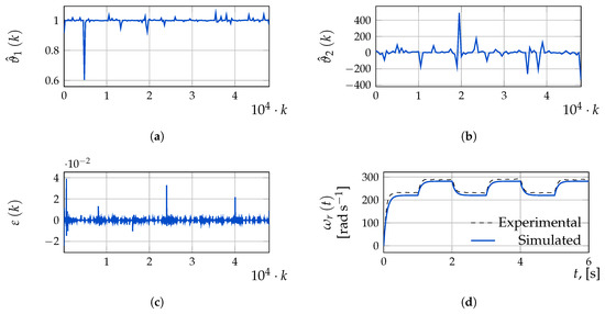 Substituting these parameters into Equation (18) and running the algorithm using an input torque of the same magnitude as the measured torque yields a very approximate output speed compared to the measured one, however, a steady-state error can be appreciated during the whole tests, which reveals a poor estimate of the parameter and, by extension, of the damping coefficient. In fact, this parameter is the one that most differs from the expected value, as presented in Section 4.4.1. This is shown in Figure 6d.