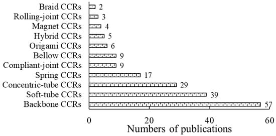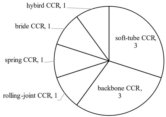 CCRs are divided into eleven types according to basic transmission units, as shown in Figure 3. Soft-tube CCRs belong to soft CCRs, while others belong to semi-soft CCRs. Backbone, soft-tube, concentric-tube and spring CCRs account for a large proportion, followed by compliant-joint, bellow, origami and hybrid CCRs, and the rest of the types are analysed by researchers recently. Their characteristics and problems are summarised in Table 2, which are detailed in the following Sections.