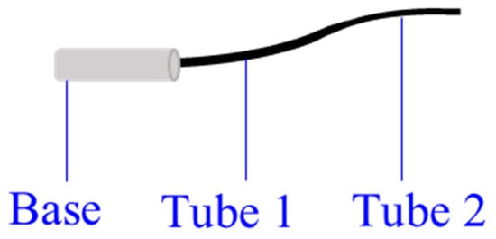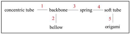 Concentric tubes are first introduced by Webster et al. [66]. Most tubes are made of superelastic Nitinol, and some of them are made of polyether block amide [67]. They are pre-curved and superelastic, as shown in Figure 6. The concentric tubes are inserted inside each other, and they are translated and rotated axially about the concentric axis at the base by tube interactions [68,69]. In this way, the length and curve of the concentric-tube CCR are varied.