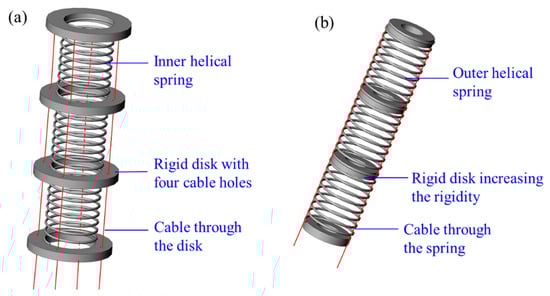 Springs can be used in two ways to form a spring CCR, including inner helical springs and outer helical springs, as shown in Figure 7. An inner helical spring can be employed as a central backbone [78,79,80,81,82,83,84,85] to evenly distribute disks. An outer spring can be multi-disks to confine cables [86,87,88]. Most spring CCRs are made of steel or NiTi, and they are actuated by cables.