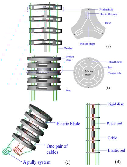 Compliant continuum robots (CCRs) are usually made of elastic materials, including nitinol alloy (NiTi) [1,2,3], silicone [4], rubber [5] and polyamide [6], etc. They are designed to be slender, i.e., low diameter to length ratio. CCRs have been widely employed in a constraint environment to manipulate tasks, such as minimally invasive cardiac surgery [7], orthopaedic surgery [8,9,10], endoscopic surgery [11], bariatric surgery [12] and the inspection of gas turbine engines [13], in-situ aero-engine maintenance works [14,15,16,17]. Researchers usually classify CCRs in two ways, one is the drive system classification, including tendon-driven robots, cable-driven robots, pneumatic robots, shape-memory-alloy robots. Another is the biotic classification, including trunk-like [14], octopus-like [15], sea horse-like [16,17], tentacle-like [18] and tendril-like [19] robots. In this paper, we classify the CCRs into two groups, including semi-soft continuum robots and soft continuum robots. Semi-soft continuum robots are made of elastic metals, sometimes rigid disks or rods are added to increase rigidity [20]. Soft continuum robots have no rigid parts, and most of them are made of silicone or rubber [15]. The characteristics of the CCRs relate to the basic transmission unit significantly, which motivates us to further classify the CCRs according to basic transmission units and inspire new designs of CCRs.