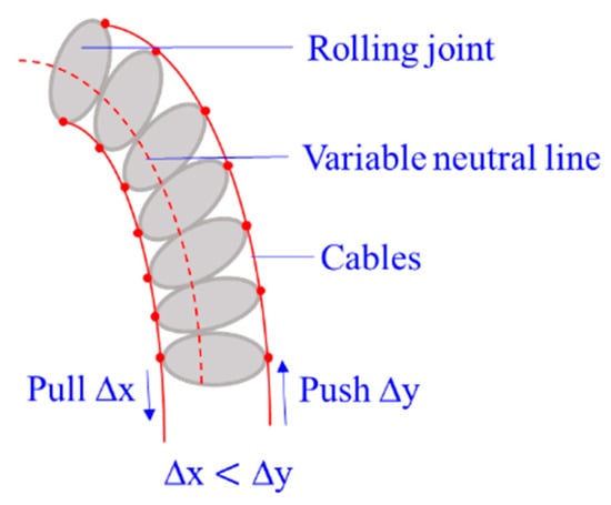 Rolling-joint CCRs are special for a variable neutral line of the robot, as shown in Figure 12. Most rolling joints are made of ABS material to reduce weight. They are actuated by non-circular spur gears [104] as the asymmetric arrangement of rolling joints (∆x ≠ ∆y), and the nonlinear actuating relationship of force and tension is complex to model [105]. Compared with the friction between cables and disk holes, the friction between rolling joints should not be neglected.