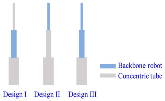 Concentric-tube CCRs can be submillimetre, but they have limited resultant curves and snapping problems. Backbone CCRs are flexible, but the coupling between different segments of a backbone CCR is still a challenge. Wu et al. [108] introduced a backbone-concentric-tube CCRs, whose dexterity is improved and the size is submillimetre. They analysed three combinations of the backbone-concentric-tube robot, as shown in Figure 14. The results show that design II can avoid snapping and coupling of different segments compared with others.