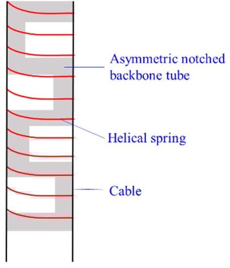 Sharp bending is a challenge for concentric-tube CCRs. To maintain the miniature size and enable sharp bending, Francis et al. [86] introduced a new asymmetric notched backbone-spring CCR, where a helical spring wraps outside of a notched backbone tube, as shown in Figure 15. The helical spring is also used to confine the cables.