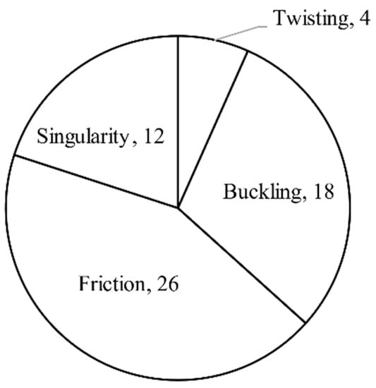 Soft-tube CCRs have a large elastic deformation and hyper-redundant DoFs. However, their higher compliance reduces the rigidity and positioning accuracy significantly [59]. The lack of rigidity of soft material can result in buckling and strong nonlinearities of the kinematic model. In 2018, Li et al. tried to avoid buckling by optimising controlling models [60]. Soft skin is easy to be torn and punctured, so Wang et al. combined different types of fibres into the silicone to improve their strength and durability [61].