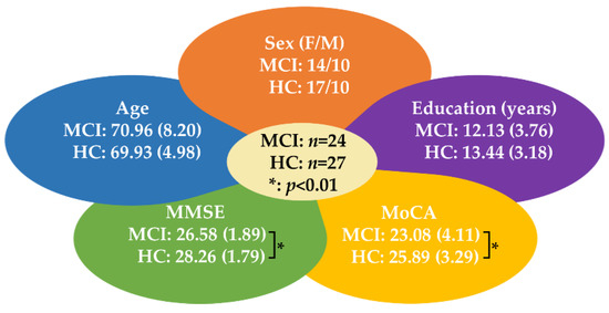 The present study enrolled 24 participants with MCI (14 females, mean age of 70.96 ± 8.2 y/o) in the experimental group and 27 (17 females, mean age of 69.93 ± 4.98 y/o) healthy individuals in the control group. Data was collected at a Memory Clinic of a tertiary 2700-bed referral medical center. Based on the results of clinical interviews, laboratory reports, brain imaging findings, and performance of neurocognitive assessments, the diagnostic impression was made under clinical consensus by a group of board-certified healthcare providers. Recommendations from the National Institute on Aging and the Alzheimer’s Association (NIA-AA) [43,44] were used as the core clinical criteria for diagnosis of MCI. Individuals defined as the control group were recruited via advertisement and confirmed as not having any condition for all-cause dementia listed in the NIA-AA criteria.