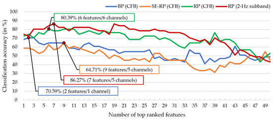 Comparison of MCI-HC classification accuracy among conventional frequency band (CFB)-based BP, SE-RP (CFB), RP (CFB), and 2-Hz-width subband-based RP based on the LDA classifier. The total numbers of feature candidates for the four features are 150, 150, 2175, and 9135, respectively. The best classification accuracies for the four features are 70.59%, 64.71%, 80.39%, and 86.27%, respectively. In terms of RP (2-Hz subband), its accuracy curve reached the maximum 86.27% when the number of top-F-score-ranked-feature increased to 7, which occupy only a very small portion of the whole RP feature candidates (7/9135 = 0.07%).