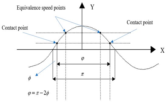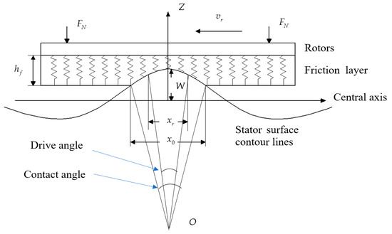 Figure 3 illustrates the parameters of the contact model during a traveling wave period. The contact model gives a radian from the contact length , which is calculated on the measured preload and feedback voltage in Section 2.1. is half of the range except for the contact zone. Then, we can get .