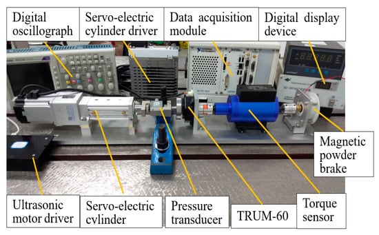 As shown in Figure 4. The TRUM-60 was driven by an ultrasonic motor driver. The preload was provided by a servo-electric cylinder (DDA-40, Dingying Intelligent Equipment Co., Ltd., Shenzhen, China). The servo-electric cylinder is driven by an actuator. A pressure transducer (TSC-1000, Toledo Corporation, Shanghai, China) sensed the preload and generated a force signal which was displayed by a digital display device. Torque sensor (CYT-303, Tianyu Hengchuang Sensor Technology Co., Ltd., Beijing, China) with data acquisition module (PXI-1031, NI, Austin, TX, USA) can record motor speed, torque and power signals. The tension controller (SC-1K, Lanling Mechanical and Electrical Technology Co., Ltd., Jiangsu, China) provides a stable current input to the magnetic powder brake (FKG-10, Lanling Mechanical and Electrical Technology Co., Ltd., Jiangsu, China). The magnetic powder brake provided a simulated load for the TRUM-60. The digital oscilloscope is used to measure the electrical signal of the ultrasonic motor.
