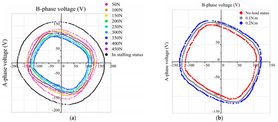 The drive frequency is 42 kHz. As can be seen from Figure 5a, when the motor is at no load and the preload increases from 50 N to 300 N, the two-phase drive voltage amplitude gradually decreases, but the magnitude of the decrease is not obvious and is reflected in the Lissajous curve, where the enclosed zone gradually decreases and reaches a minimum at 350 N. When the preload reaches 350 N, the A-phase drive voltage amplitude decreases to 110 V and 112 V in the opposite directions. The B-phase drive voltage amplitude decreases to 101 V and 96 V in the opposite directions. The four voltage amplitudes have an average value of 106 V, which is 35 V less than the average value at 50 N. As the preload continues to increase, the two-phase voltage amplitude begins to increase again. Too much voltage difference between phase A and phase B will damage the amplitude stability of the traveling waves. If this situation happened, the stator surface mass of the elliptical motion trajectory would distort, causing unstable operations due to a poor contact state. Figure 5b shows that when the preload is 350 N and drive frequency is 42 kHz, the amplitude of the drive voltage increases as the load increases. Therefore, it can be summarized from the above two figures that, for the drive voltage without any load, an increase in preload will result first in a decrease and then an increase. When the motor has a certain preload, the drive voltage will increase with the load.