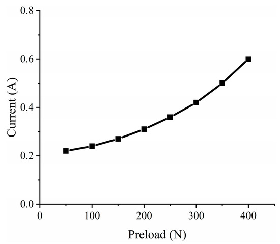The drive frequency is 42 kHz. The load is zero. Figure 6 shows that as the preload increases, the current increases exponentially. The minimum current is 0.22 A at 50 N preload, When the preload is 400 N the maximum current is 0.6 A.