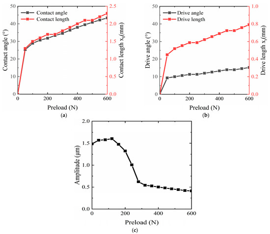 Contact interface parameters for no-load conditions at different preloads: (a) Contact length and contact angle; (b) Drive length and drive angle; (c) Amplitude.