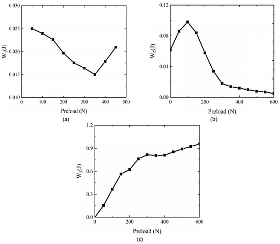 From Figure 8a, the dielectric loss is defined by the drive voltage and the electrical parameters. The drive voltage is influenced by preload. Based on the results in Section 3.1, we can find that the dielectric loss follows a similar trend to the drive voltage with preload. Dielectric loss decreases and then increases with preload. Losses are minimized when the pre-pressure reaches 350 N. Figure 8b shows that the damping loss of the composite stator follows a similar trend to the variation of amplitude with preload. It keeps increasing in the range 0–100 N. When the preload is 100 N–300 N, the damping loss decreases rapidly. After that, the decrease slows down and tends to 5 × 10−3 J. This is because the energy loss in material bending is proportional to the square of the vibration amplitude, the bending stiffness and bending angle, according to Equation (17). Figure 8c shows that the frictional losses will increase with increasing preload.