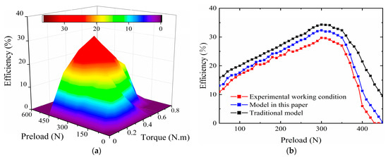 Figure 9a shows the efficiency’s overall map with the preload and output torque. The driving frequency is 42 kHz. The drive voltage is 150 V. The output efficiency’s 3D surface basically maintains the trend of increasing and then decreasing. We choose a typical 0.2 N.m torque and illustrated the simulation and experimental result in Figure 9b. A simulation curve with the traditional model is added for comparison. The driving frequency is 42 kHz. The drive voltage is 150 V. The experimental curve is below the simulation curve of the new model for two main reasons: firstly, the efficiency model is built with more simplifications, simplifying the stator ring with teeth to a simply supported beam, resulting in smaller stator damping losses than the actual losses; compared to the 3D contact model, the contact interface is simplified to a 2D contact model, and no radial sliding losses are considered. Secondly, only three relatively large energy losses are considered in the efficiency model, and other loss types are not accounted into simulations.