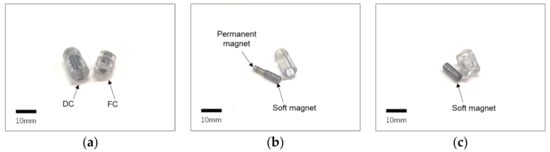 (a) Prototype of modular capsules. (b) The driving capsule (DC) showing the combination of the permanent magnet and soft magnet inside. (c) The functional capsule (FC) with the soft magnet.