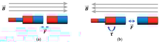 Pure iron is used as the material for the cylindrical soft magnet. Pure iron has high permeability, low coercivity and higher saturation magnetization than other similar soft magnetic materials. For the driving capsule, a combination of a small permanent magnet and soft magnets with cylindrical shapes is used. The purpose of this is to increase the propulsion force when transporting the modular capsules without changing the magnetization direction of the soft magnet in the driving capsule. In contrast, only a cylindrical soft magnet is used in the functional capsule. Due to the anisotropy of the soft magnets, when an external magnetic field is applied, the soft magnet is automatically magnetized along the easy axes. In the case of cylindrical soft magnets, the easy axes can simply be regarded as the long axis of the cylinder [24]. When the direction of the external magnetic field is the same as that of the permanent magnet, the driving capsule and the functional capsule can be magnetized in the same direction and an attractive force to combine the capsules is generated. Meanwhile, when the magnetic field changes to be in the opposite direction, the magnetization direction of the soft magnet in the functional capsule also goes in the opposite direction. However, the magnetization direction of the soft magnet in the driving capsule does not change owing to the presence of the permanent magnet. Thus, the two capsules produce a weak repulsive force between each other, the driving capsule also generates separating torque due to the changes in the external magnetic fields. As a result, the two capsules become separated. Figure 4 shows the magnetization process. In particular, in order to easily control the assembly and separation of the modular capsules, the magnetization direction of the soft magnet within the functional capsule can be easily controlled by external magnetic fields while it is not magnetized by the permanent magnet of the driving capsule. Thus, a small gap of about 1 or 2 mm is set at the intersection between the two soft magnets to prevent contact with each other. Moreover, the higher magnetic permeability of the soft magnet in the driving capsule also creates a magnetic shielding effect, further reducing the impact on the soft magnet of the functional capsule. As a result, when the external magnetic field is set in the opposite direction, the magnetization of the soft magnet in the functional capsule is affected by the external magnetic fields more than it is by the permanent magnet in the driving capsule. Otherwise, if only permanent magnets were used alone as the magnetic material in the driving capsule, they may affect the magnetization of the soft magnet in the functional capsule and thus the separation function may not work properly. This is why a single permanent magnet is not used directly in the driving capsule.
