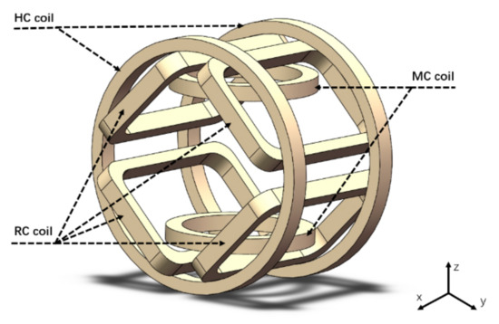The complex motions for recombination and locomotion of the modular capsules can be well achieved using external magnetic fields controlled by an EMA system [25]. As shown in Figure 5, the EMA system consists of a pair of Helmholtz coils (HC) coils, a pair of Maxwell coils (MC) coils, and two pairs of Rectangular coils (RC) inclined at 45°. Detailed specifications of the coils are shown in Table 3. Compared with conventional pair-coil control, the EMA system uses an independent control algorithm to control the magnetic field allowing greater flexibility. When the direction of the magnetic fields is entered in the LabView control program (NI, Austin, TX, USA), the required current value for each coil is calculated. This is then provided as an input value to the power supply unit (AMETEK, Inc., San Diego, CA, USA) which supplies the currents to each of the eight coils separately. The EMA system can indirectly control the modular capsule by controlling the magnetic field in the region of interest (ROI). The magnetic torque () and force () exerted on the modular capsules placed in the ROI can be expressed as follows: