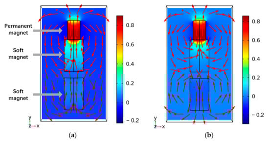 To verify the feasibility of the proposed mechanism for the modular capsules outlined above, FEM simulations using the COMSOL Multiphysics software (COMSOL, Inc., Stockholm, Sweden) were completed and simple experiments were conducted. Figure 6 shows the simulation results for two representative cases of assembly and separation of the modular capsules. The magnetic materials contained in the modular capsules were modeled in 3D with the same shape and size as in the real-world prototype, the material properties of each material in the prototype were applied in the simulation. The small permanent magnet in contact with a larger soft magnet is the magnetic substance in the driving capsule, while the separated soft magnet is the magnetic substance in the functional capsule. In the simulation results, the arrows indicate the direction of the magnetic flux density under a uniform magnetic field of 0.01 T, such as that generated by the EMA system. As shown in Figure 6a, when an external magnetic field is applied in the magnetization direction of the permanent magnet, the magnetization of the driving module and the functional module are the same. Thus, an attractive force is generated between the modular capsules. Whereas, if the external magnetic field is in opposite direction to that of the permanent magnet, the magnetization directions of the driving capsule and the functional capsule are opposite to each other, resulting in a repulsive force.