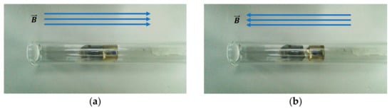 As shown in Figure 7, the prototype modular capsules were placed in a glass tube in the center of an EMA system. Then, an external magnetic field was generated using the EMA system along the magnetization direction of the permanent magnet in the driving capsule. As a result, it can be seen that in Figure 7a the two modules become attached. Then, when the direction of the magnetic fields is reversed, they become separated by the weak repulsive force, as shown in Figure 7b. Through the above simple experiments and FEM simulation, it was verified that the proposed assembly and separation mechanism of the modular capsules can be successfully implemented by controlling the magnetization direction of soft magnetic substances in the functional module. However, no further verification of the repulsive force for separation was conducted, because theoretically, as long as there is no attractive force between the modules, the capsules will gradually separate while the actual repulsive force is too small to be detected.