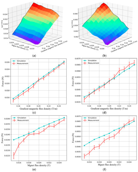Result of propulsion force measurements. Measured propulsion force of the driving capsule (a), and functional capsule (b). Relationship between the propulsion force and gradient magnetic field under a fixed magnetic flux density for the driving capsule (c), and for the functional capsule (d). Relation between the propulsion force and magnetic flux density under a fixed gradient magnetic field for the driving capsule (e), and for the functional capsule (f).